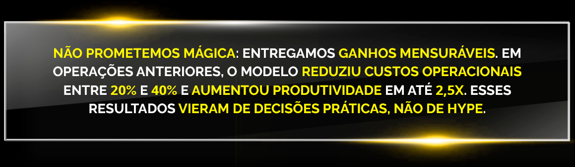 Não prometemos mágica: entregamos ganhos mensuráveis. Em operações anteriores, o modelo reduziu custos operacionais entre 20% e 40% e aumentou produtividade em até 2,5x. Esses resultados vieram de decisões práticas, não de hype.